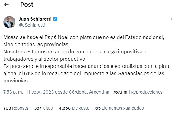 «Es poco serio e irresponsable hacer anuncios electoralistas con la plata ajena: el 61% de lo recaudado del Impuesto a las Ganancias es de las provincias», evaluó Schiaretti.
