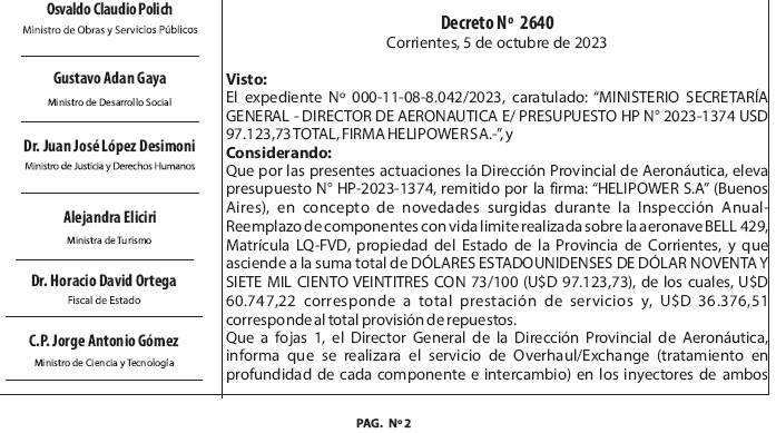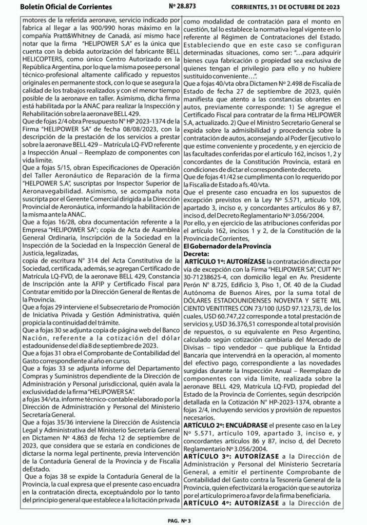El Gobierno de la provincia a través del Decreto Nº 2640 pagó el service, compra y renovación de repuestos del helicóptero oficial que es utilizado por el gobernador; por un total fue: U$D 97.123,73 (dólares estadounidenses). (Ver FOTO del Boletin Oficial)