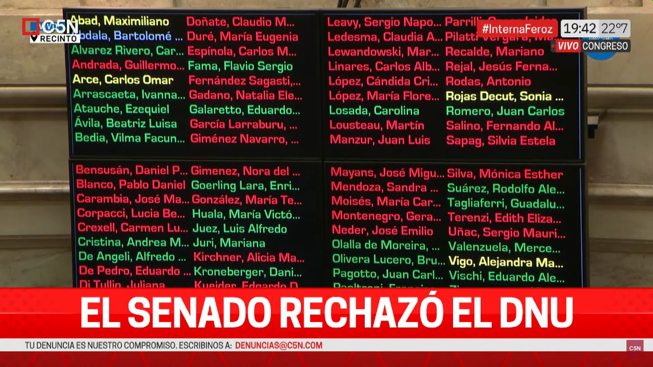 El rechazo al DNU tuvo 42 en contra, principalmente de los bloques de Unión por la Patria, Unidad Federal y provinciales; a favor del DNU de Javier Milei votaron 25 senadores.