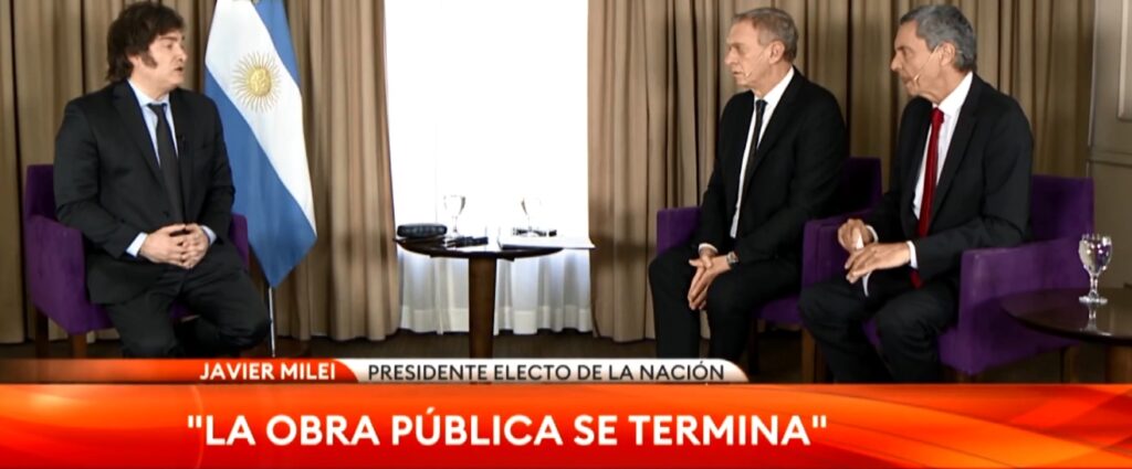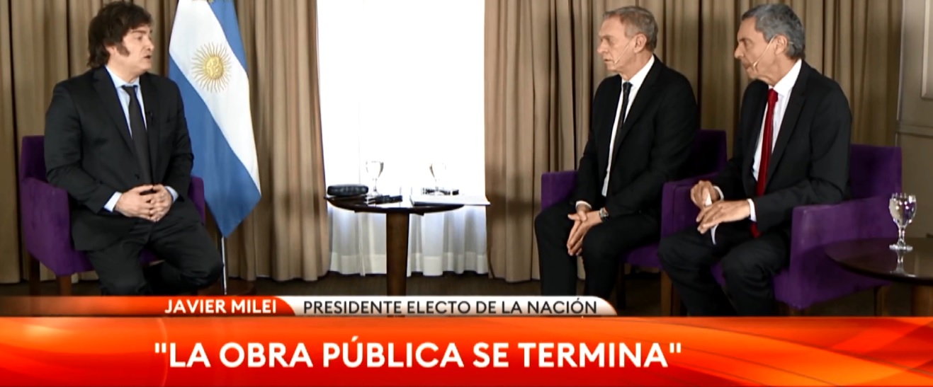 «La obra pública se termina, no tenemos plata. Hay que licitarla para que la haga el sector privado. Y si nadie quiere hacerla, significa que esa obra no tenía sentido desde el punto de vista económico y alguien va a tener que explicar por qué hicieron una obra que nadie quería hacer», se explayó el presidente electo.